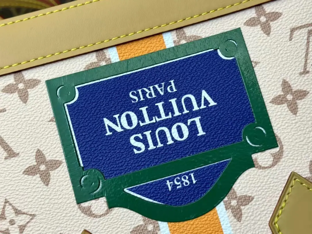 ベージュのモノグラム キャンバスをアール デコ風のシェイプに仕立て、パリジャン風のストリートサインから着想を得たモチーフに Louis Vuitton Paris シグネチャーをあしらいました。